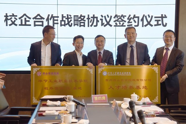 隨后,貴州洪山投資控股有限公司董事長(zhǎng)金烈森和學(xué)院院長(zhǎng)邱國(guó)援簽訂了校企合作戰(zhàn)略協(xié)議書(shū),并完成授牌儀式。