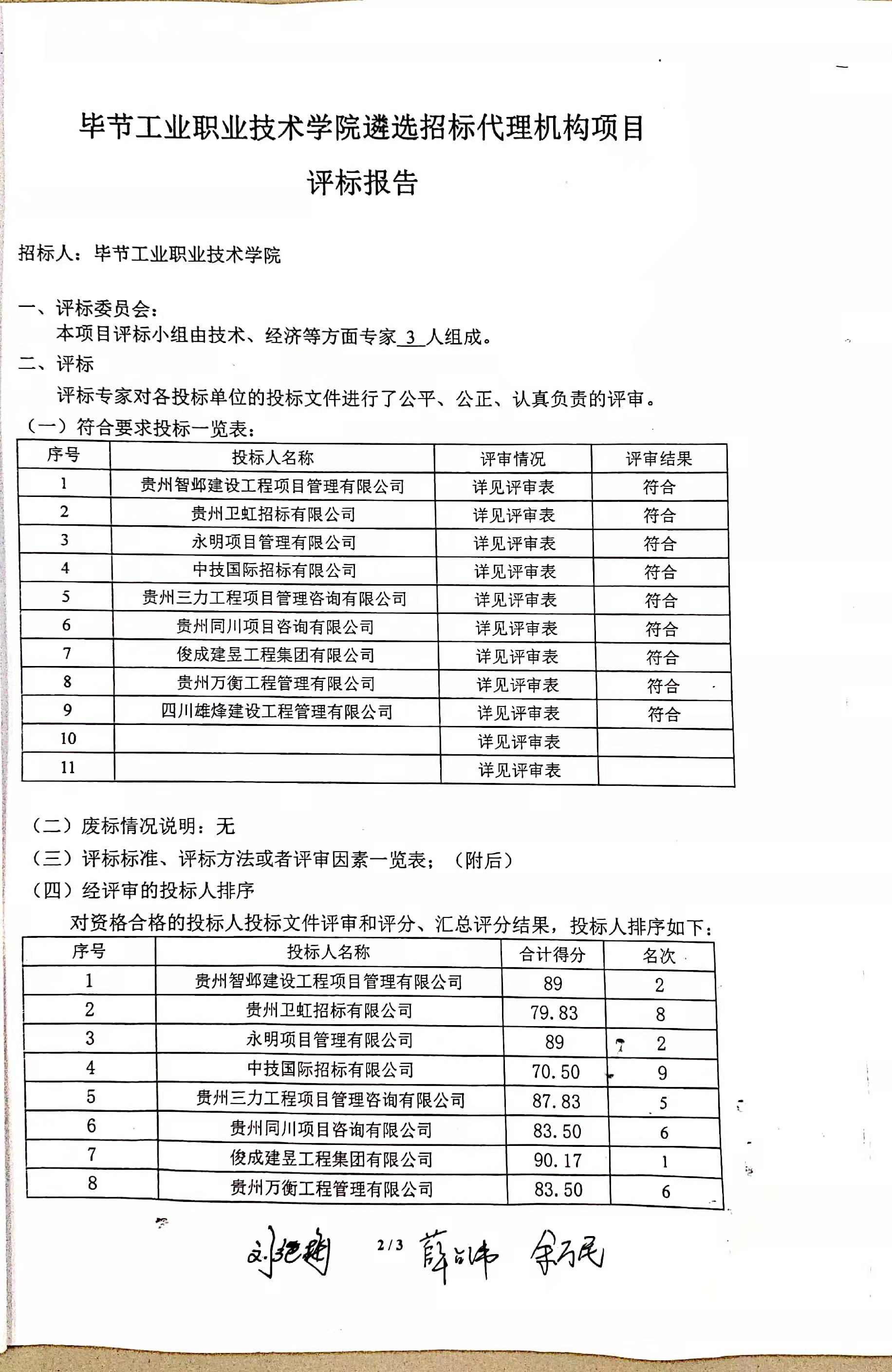 畢節(jié)工業(yè)職業(yè)技術學院遴選招標代理機構項目評標報告