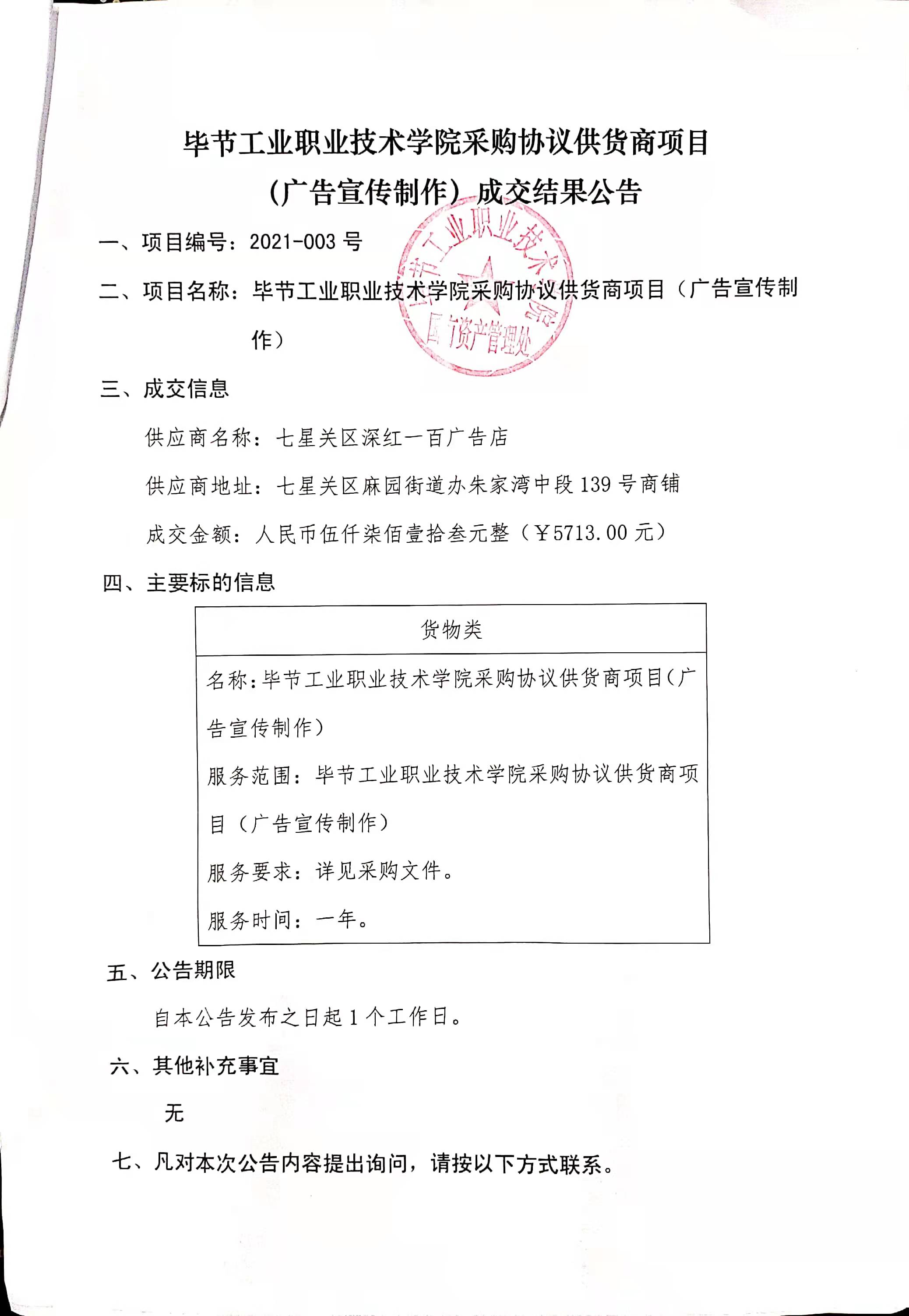 畢節(jié)工業(yè)職業(yè)技術(shù)學(xué)院采購(gòu)協(xié)議供貨商項(xiàng)目(廣告宣傳制作)成交結(jié)果公告
