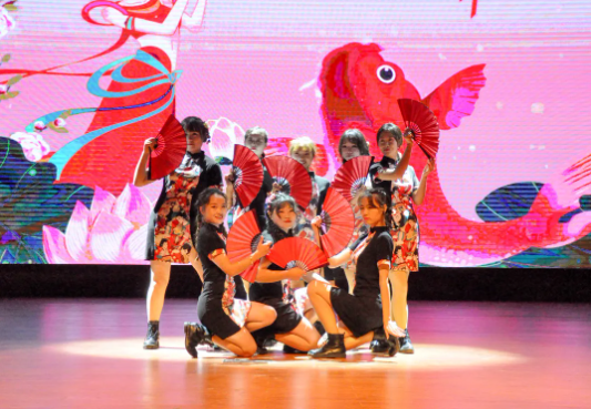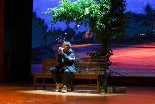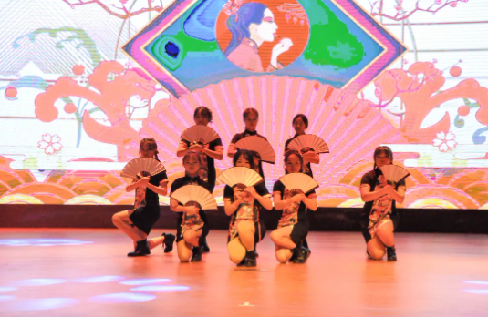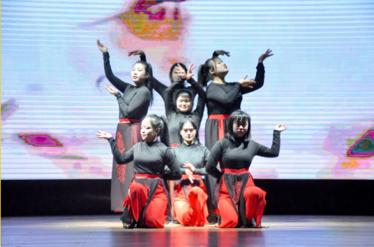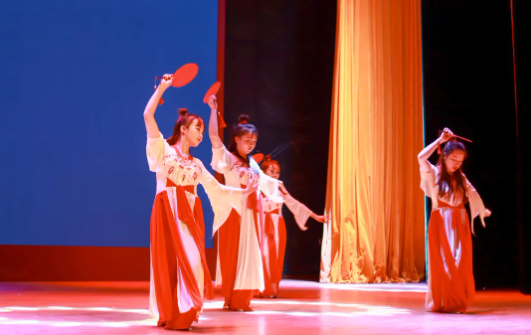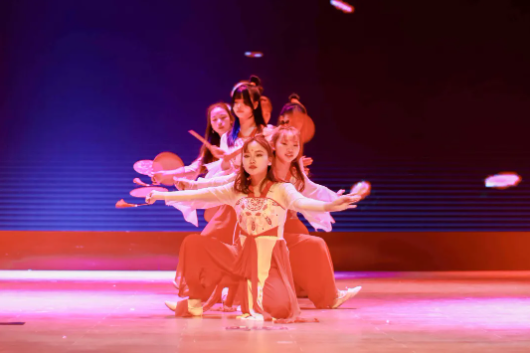 演員們舞姿靈動(dòng),神采飛揚(yáng),姿態(tài)曼妙,盡顯柔美;燈光做新衣,伴樂也陶醉,翩翩輾轉(zhuǎn),是誰的心頭泛起了漣漪。