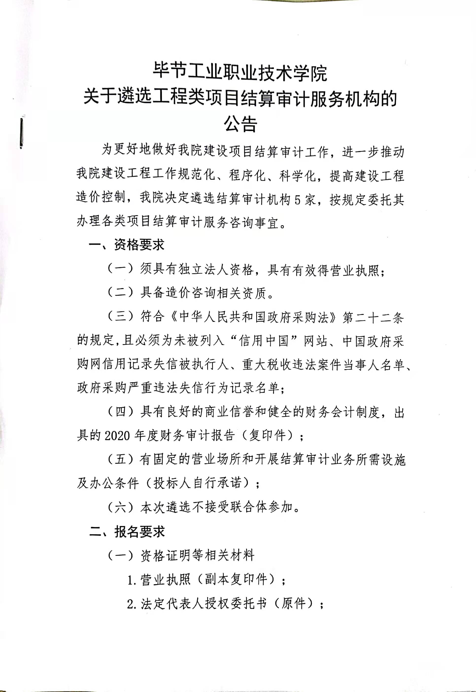 畢節(jié)工業(yè)職業(yè)技術(shù)學(xué)院關(guān)于遴選工程類項目結(jié)算審計服務(wù)機(jī)構(gòu)的公告