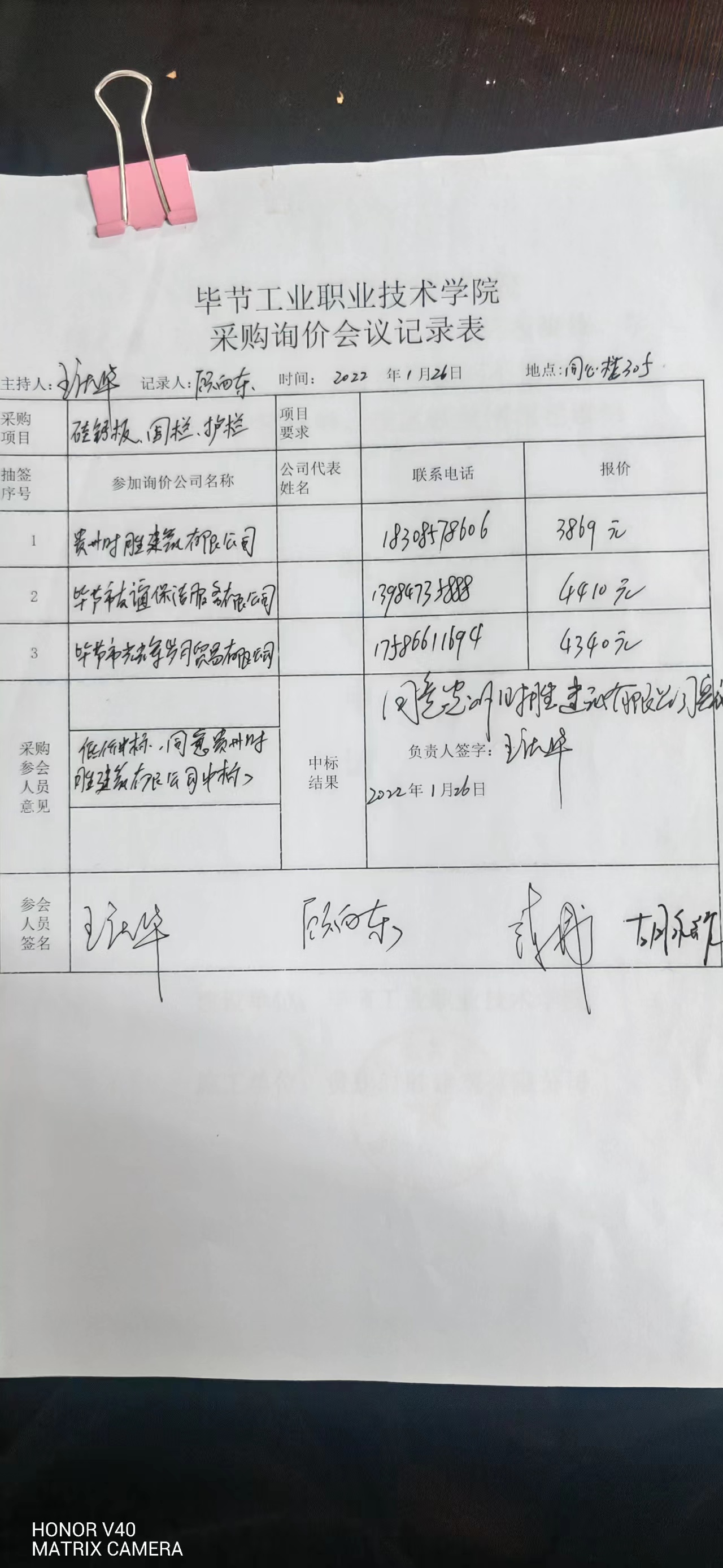 畢節(jié)工業(yè)職業(yè)技術學院硅鈣板、圍欄、護欄采購詢價會議記錄表