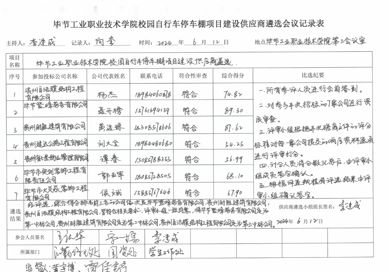 畢節(jié)工業(yè)職業(yè)技術(shù)學(xué)院校園自行車停車棚項目建設(shè)供應(yīng)商遴選結(jié)果公示