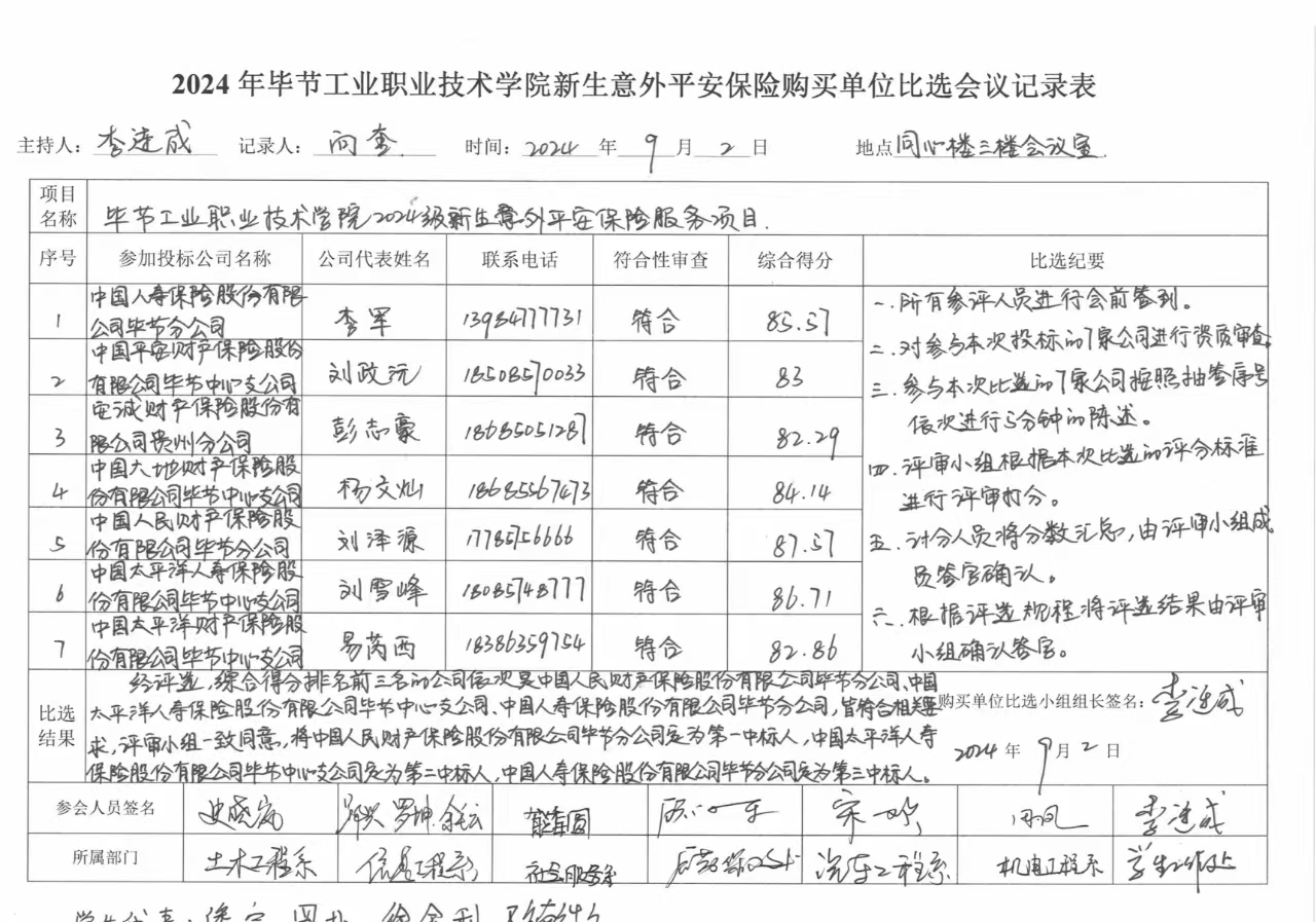 畢節(jié)工業(yè)職業(yè)技術(shù)學(xué)院2024級新生意外平安保險(xiǎn)服務(wù)項(xiàng)目比選結(jié)果公告