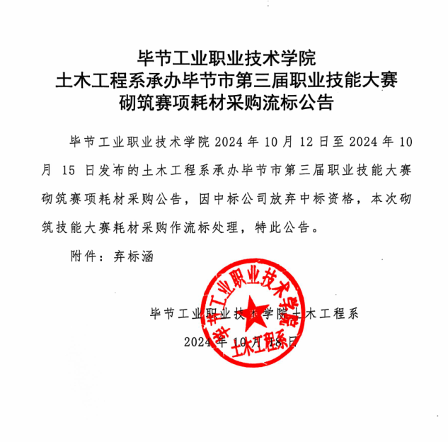 畢節(jié)工業(yè)職業(yè)技術學院土木工程系承辦畢節(jié)市第三屆職業(yè)技能大賽砌筑賽項耗材采購流標公告