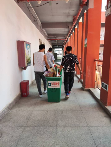 2021年9月2日中午,第三教學(xué)黨支部的黨員教師做好帶頭作用,親自清掃各樓層垃圾滿溢的垃圾桶,和學(xué)生一起到垃圾回收點(diǎn)倒垃圾。