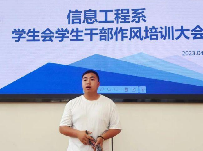 為進一步提升信息工程系學生會成員整體素質,切實幫助學生干部提高工作能力,2023年4月19日,我系第二次學生干部作風培訓大會在崇德樓一樓階梯教室召開,系部學生會主席團主持會議。