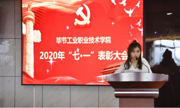 大會(huì)開(kāi)始,全體起立,奏唱國(guó)歌。李涌首先代表畢節(jié)工業(yè)職業(yè)技術(shù)學(xué)院黨委向全體黨員師生致以節(jié)日的問(wèn)候,向受表彰的優(yōu)秀共產(chǎn)黨員和優(yōu)秀黨務(wù)工作者表示熱烈的祝賀和崇高的敬意。并希望受表彰的同志珍惜榮譽(yù)、發(fā)揚(yáng)成績(jī),為不斷鞏固和推動(dòng)學(xué)院發(fā)展再立新功,切實(shí)為穩(wěn)步推進(jìn)工職院各項(xiàng)工作貢獻(xiàn)力量。
