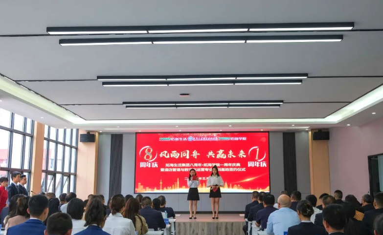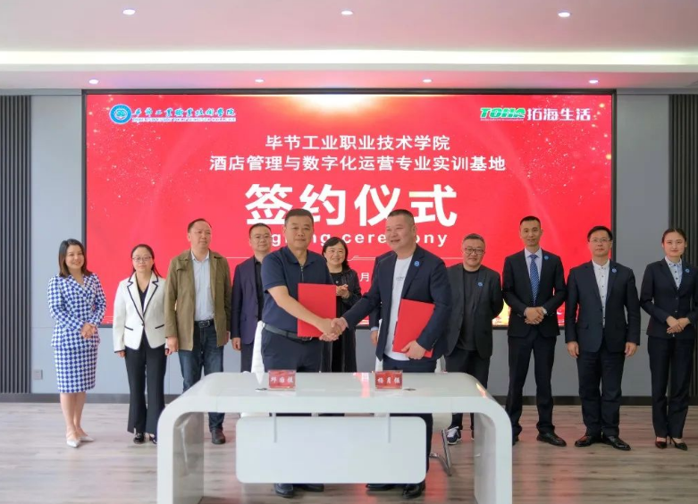 5月12日,畢節(jié)工業(yè)職業(yè)技術(shù)學(xué)院拓海學(xué)院一周年成立儀式暨畢節(jié)工業(yè)職業(yè)技術(shù)學(xué)院酒店管理與數(shù)字化運(yùn)營(yíng)專業(yè)實(shí)訓(xùn)基地簽約儀式在拓海學(xué)院會(huì)議室舉行。學(xué)院黨委副書記、院長(zhǎng)邱國(guó)援,黨委委員、副院長(zhǎng)黃瑛、黃河、吳家文、黃文碧,拓海學(xué)院名譽(yù)院長(zhǎng)、拓海生活集團(tuán)總裁楊月強(qiáng),拓海學(xué)院院長(zhǎng)林彬出席儀式,拓海集團(tuán)相關(guān)領(lǐng)導(dǎo)、員工代表及學(xué)院社會(huì)服務(wù)系師生代表參加儀式。 儀式現(xiàn)場(chǎng) 邱國(guó)援在致辭中指出,校企雙方共建拓海學(xué)院實(shí)訓(xùn)基地,為相關(guān)專業(yè)學(xué)生提供了理實(shí)一體化教學(xué)場(chǎng)地和實(shí)習(xí)實(shí)訓(xùn)平臺(tái),改善了物業(yè)管理、酒店管理等專業(yè)的教學(xué)、實(shí)訓(xùn)條件,使我院辦學(xué)條件、人才培養(yǎng)體系和教學(xué)質(zhì)量得到不斷提高。同時(shí),拓海集團(tuán)積極參與物業(yè)管理專業(yè)人才培養(yǎng)方案修訂,從行業(yè)、企業(yè)角度提出了很多人才培養(yǎng)的意見建議,邀請(qǐng)行業(yè)專家來(lái)校講學(xué),親自授課,使學(xué)生專業(yè)知識(shí)得到有力提升,使物業(yè)管理專業(yè)人才培養(yǎng)體系更加符合行業(yè)需求。下一步,希望校企雙方繼續(xù)深化校企合作機(jī)制、持續(xù)擴(kuò)大合作范圍、協(xié)同提升合作質(zhì)量,充分發(fā)揮拓海生活服務(wù)集團(tuán)在物業(yè)管理方面的專業(yè)優(yōu)勢(shì),在人才培養(yǎng)方案、課程教學(xué)、實(shí)習(xí)實(shí)訓(xùn)、教師培養(yǎng)等方面提供企業(yè)建議和技術(shù)指導(dǎo),在教育教學(xué)、學(xué)生管理、素質(zhì)培養(yǎng)、技能提升等方面與學(xué)院交換經(jīng)驗(yàn),提升教師專業(yè)素質(zhì),強(qiáng)化學(xué)生技能提升,推進(jìn)“工學(xué)結(jié)合”教學(xué)模式,共同提高學(xué)院育人質(zhì)量。 邱國(guó)援在儀式上致辭 楊月強(qiáng)表示,過(guò)去一年,校企雙方本著優(yōu)勢(shì)互補(bǔ)、資源共享、互惠雙贏、共同發(fā)展的原則,對(duì)校企合作模式進(jìn)行了深層次的探索、創(chuàng)新與實(shí)踐,拓海學(xué)院的成立不僅推動(dòng)了產(chǎn)教融合,也為學(xué)生提供了優(yōu)質(zhì)的實(shí)訓(xùn)基地,為企業(yè)提供了強(qiáng)有力的人才保障。下一步,企業(yè)將繼續(xù)聯(lián)手學(xué)院不斷創(chuàng)新,共同培養(yǎng)高素質(zhì)技術(shù)技能型人才,構(gòu)建校企合作雙贏局面,助推職業(yè)教育改革和地方經(jīng)濟(jì)社會(huì)高質(zhì)量發(fā)展。 楊月強(qiáng)在儀式上講話 儀式上,邱國(guó)援代表學(xué)院與拓海生活集團(tuán)簽訂了《畢節(jié)工業(yè)職業(yè)技術(shù)學(xué)院酒店管理與數(shù)字化運(yùn)營(yíng)專業(yè)實(shí)訓(xùn)基地(中心)建設(shè)合作協(xié)議》。學(xué)院與拓海生活集團(tuán)將再次攜手,共建畢節(jié)工業(yè)職業(yè)技術(shù)學(xué)院酒店管理與數(shù)字化運(yùn)營(yíng)專業(yè)實(shí)訓(xùn)基地,共同承擔(dān)科研項(xiàng)目、實(shí)現(xiàn)信息共享,培養(yǎng)更多高質(zhì)量的技能人才,為畢節(jié)全面推進(jìn)鄉(xiāng)村振興提供有力的人才支撐。 簽約儀式現(xiàn)場(chǎng) 拓海學(xué)院院長(zhǎng)林斌、社會(huì)服務(wù)系主任呂振欣為優(yōu)秀學(xué)生羅達(dá)麗、李定奎頒發(fā)榮譽(yù)證書 優(yōu)秀學(xué)生代表羅達(dá)麗發(fā)言 儀式中的精彩節(jié)目