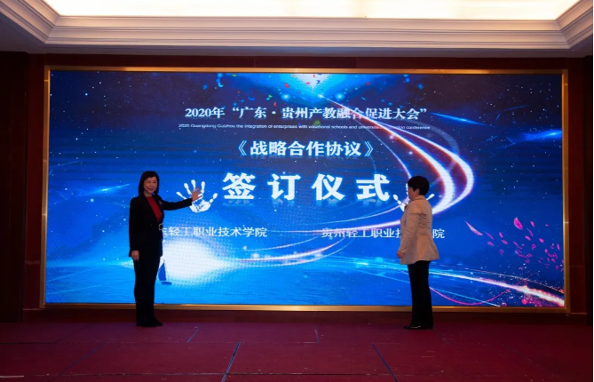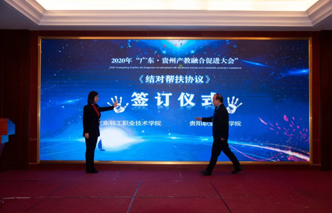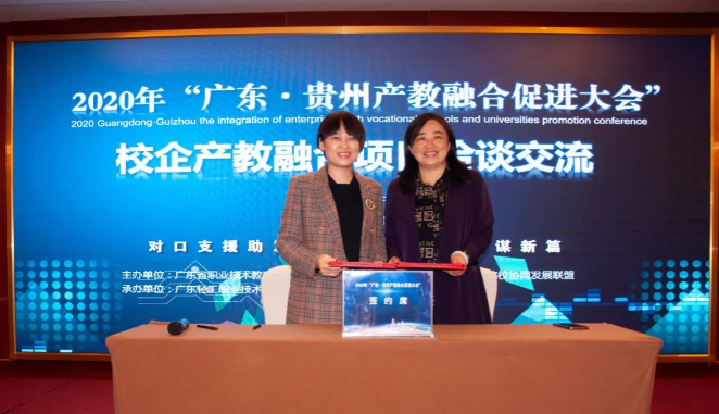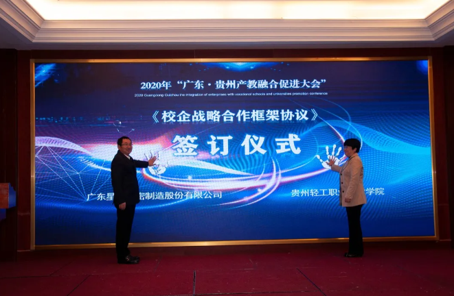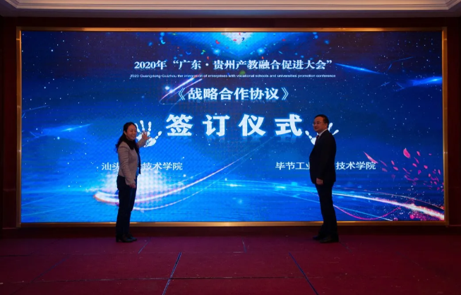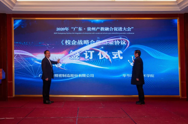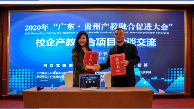 東西部協(xié)作,產(chǎn)教融合助發(fā)展。對(duì)深入推動(dòng)產(chǎn)教融合、校企合作、專業(yè)布局緊扣產(chǎn)業(yè)發(fā)展、教育教學(xué)改革貼近人才培養(yǎng)需求等發(fā)揮了助推作用,將使貴州職業(yè)教育深化產(chǎn)教融合、校企合作打開(kāi)一個(gè)全新的局面。 貴州省教育廳一級(jí)巡視員鞠洪在會(huì)上表示,隨著中央、省一系列政策、措施的出臺(tái)實(shí)施,產(chǎn)教融合發(fā)展將迎來(lái)更好的發(fā)展機(jī)遇。廣東·貴州產(chǎn)教融合促進(jìn)大會(huì)的召開(kāi),為我省各職業(yè)院校與廣東省的各行各業(yè)優(yōu)質(zhì)企業(yè)和職業(yè)院校交流溝通搭建了一個(gè)廣闊的平臺(tái)。期待通過(guò)這個(gè)平臺(tái),粵黔兩地能更大范圍、更寬領(lǐng)域、更深層次開(kāi)展合作,實(shí)現(xiàn)廣東市場(chǎng)+貴州產(chǎn)品,廣東研發(fā)+貴州制造的融合發(fā)展。 廣東輕工職業(yè)技術(shù)學(xué)院黨委書(shū)記杜安國(guó)表示,落實(shí)廣黔結(jié)對(duì)幫扶舉措,發(fā)揮企業(yè)與教育的互促力量,在廣東·貴州產(chǎn)教融合促進(jìn)大會(huì)的廣闊平臺(tái)上,為校企合作牽線搭橋,共同建立長(zhǎng)期緊密的合作關(guān)系,促進(jìn)職業(yè)教育高質(zhì)量發(fā)展,實(shí)現(xiàn)職教幫扶促發(fā)展,產(chǎn)教融合謀新篇。 發(fā)揮自身優(yōu)勢(shì),助力合作共贏。畢節(jié)市人民政府副市長(zhǎng)胡愛(ài)斌在會(huì)中坦言,落實(shí)東西部扶貧協(xié)作,畢節(jié)要盡其資源,提升兩省兩市的產(chǎn)教契合度,圍繞自身的優(yōu)勢(shì),加強(qiáng)廣東企業(yè)和貴州教育的結(jié)合優(yōu)勢(shì),為畢節(jié)打造更多的“畢工強(qiáng)將”、奮力人才! 會(huì)上,廣東省向貴州職業(yè)院校捐贈(zèng)阿里云智慧校園3.0系統(tǒng),廣州市億科計(jì)算機(jī)公司向畢節(jié)工業(yè)職業(yè)技術(shù)學(xué)院捐贈(zèng)智慧黨建系統(tǒng);相關(guān)企業(yè)與院校簽訂人才專業(yè)培養(yǎng)、訂單班、校企戰(zhàn)略合作、產(chǎn)教融合項(xiàng)目20余項(xiàng)。廣東星徽精密制造股份有限公司代表參會(huì)企業(yè)進(jìn)行發(fā)言,10余家企業(yè)進(jìn)行了產(chǎn)教融合案例分享。 會(huì)中,許多學(xué)校和企業(yè)單位都精彩紛呈的展示了“自家”的優(yōu)勢(shì)及未來(lái)發(fā)展。很多校企單位在行程中便互相洽談、簽約,這些成功的簽約對(duì)產(chǎn)教融合,校企合作有了更深的意義,推進(jìn)了產(chǎn)教融合,校企合作,校校合作的進(jìn)程,引領(lǐng)時(shí)代的新篇章。 廣東?貴州產(chǎn)教融合促進(jìn)大會(huì)在畢節(jié)召開(kāi),既是山與海的對(duì)話,更是心與心的交流。職業(yè)教育的目標(biāo)是培養(yǎng)技能型的人才,深化走產(chǎn)教融合,校企合作之路,加強(qiáng)產(chǎn)教融合,校企合作,達(dá)到互惠互利,合作共贏的優(yōu)勢(shì),共同培育新時(shí)代高技能人才。